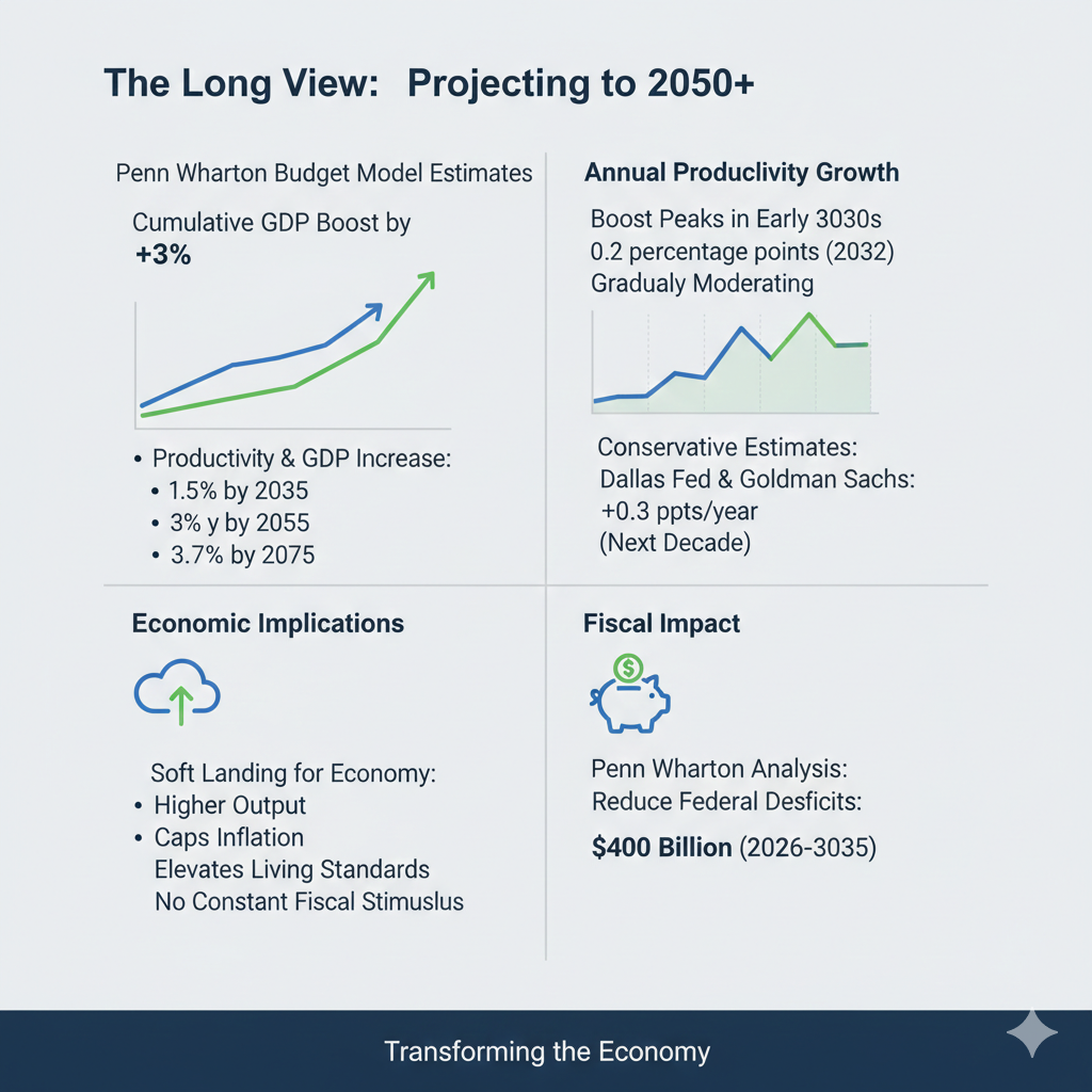 Looking ahead, projections from the Penn Wharton Budget Model suggest cumulative GDP could see a 3% boost by the 2050s as AI adoption saturates the workforce. Penn Wharton estimates that AI will increase productivity and GDP by 1.5% by 2035, nearly 3% by 2055, and 3.7% by 2075. The boost to annual productivity growth is expected to peak in the early 2030s (reaching 0.2 percentage points in 2032) before gradually moderating.