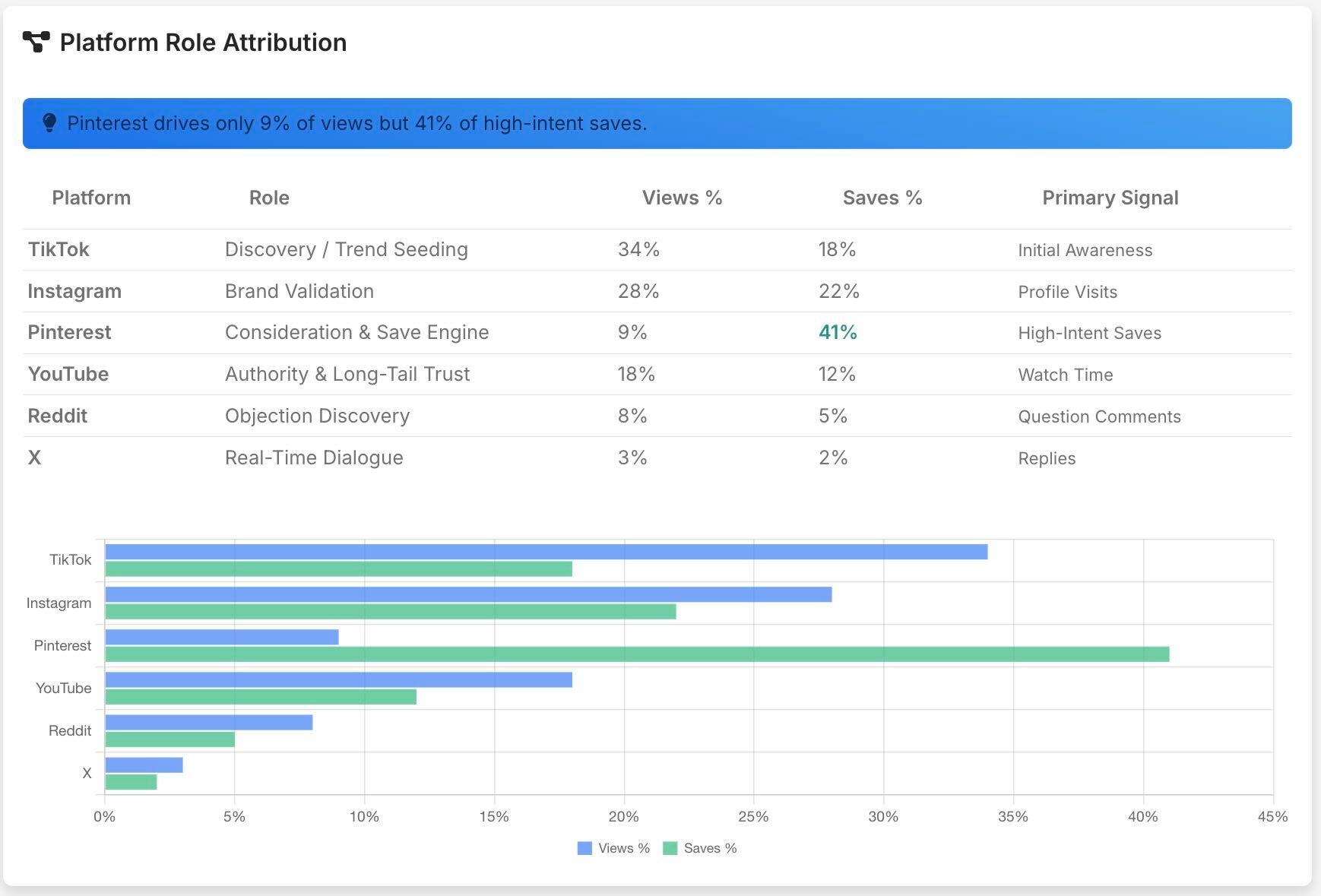 - TikTok drives 34% of views but only 18% of high-intent actions