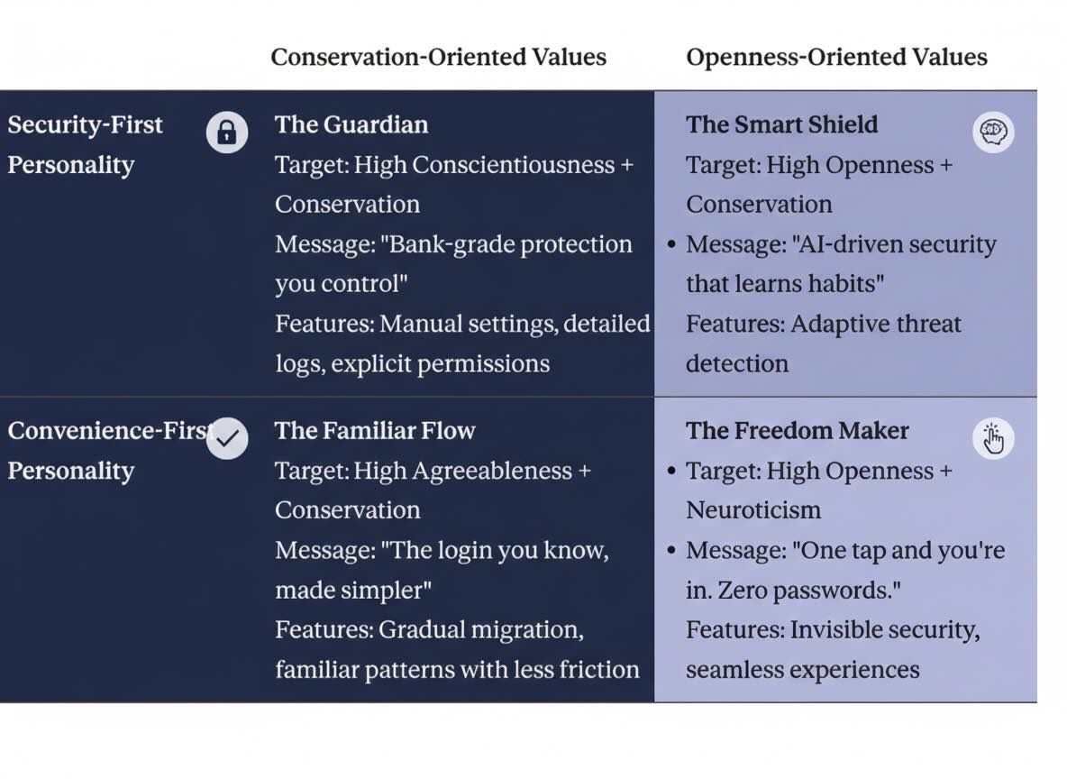 Here's why this matters: Someone can value security as a principle (Conservation) while preferring convenient implementations (Convenience-First personality). Think of the executive who demands enterprise-grade encryption but wants it to "just work" invisibly. Conversely, someone can have a Security-First personality (they actively manage settings) while valuing innovation and self-direction (Openness).